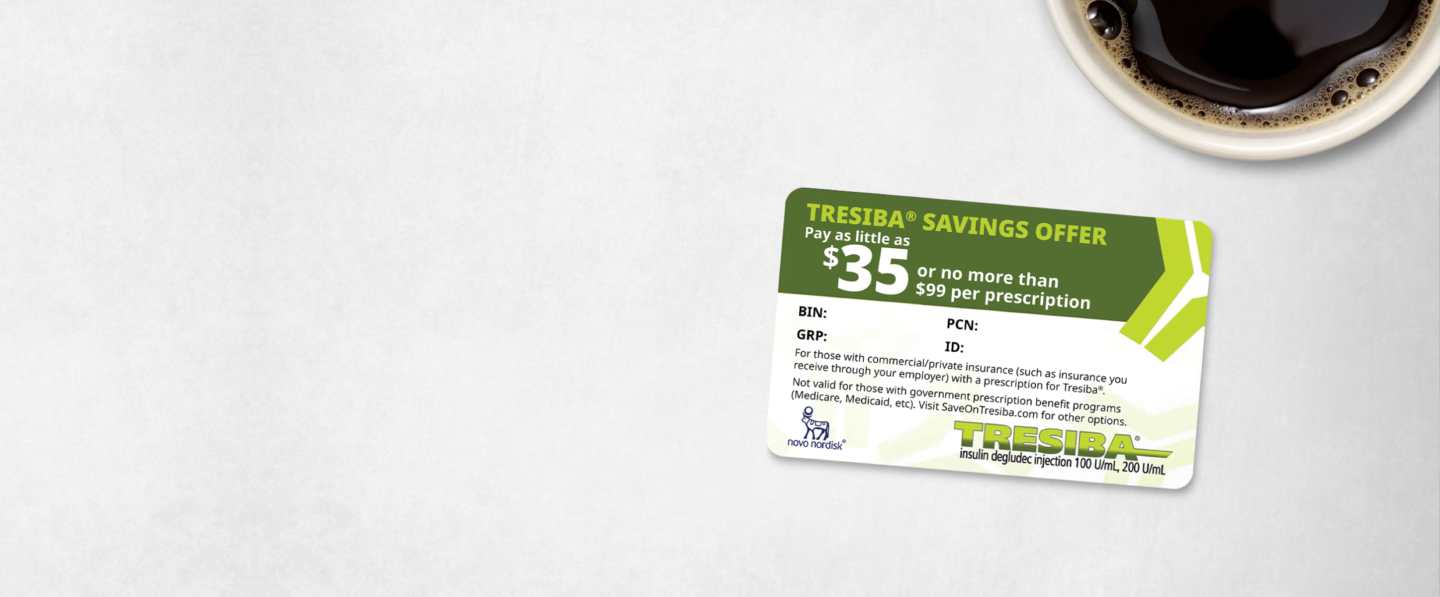 bIf you are commercially insured and Tresiba® is not covered, or Tresiba® is covered and your copay is above $100 per 30-day supply, this offer will work outside of your insurance, will not count toward any deductibles, and cannot be applied to your true out-of-pocket costs.